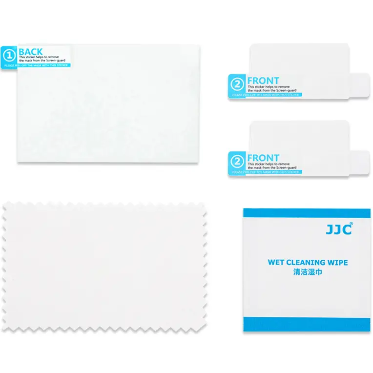 В комплект входят влажная салфетка для очистки и микрофибровая ткань. Также прилагается пара защитных пленок для вспомогательного экрана, в зависимости от модели камеры.